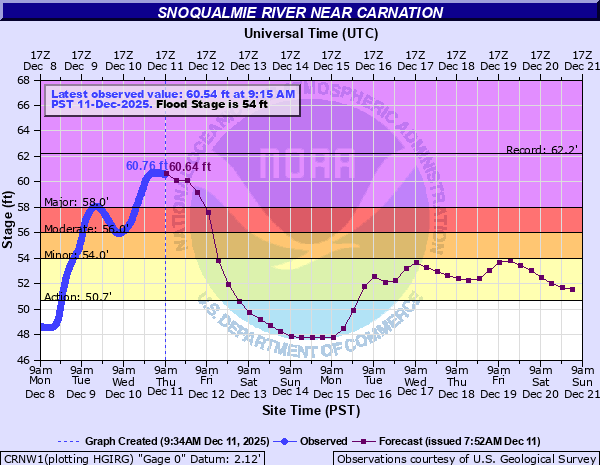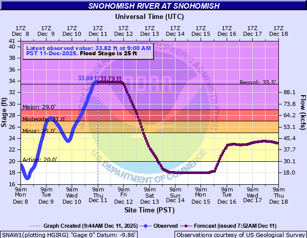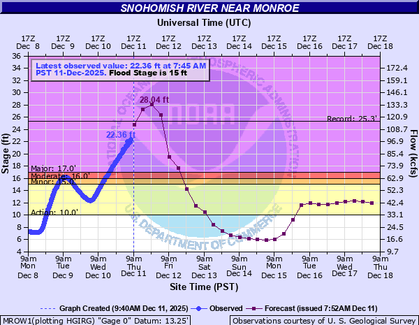 Meanwhile, on the Snohomish River at Monroe, a record crest is expected later today.