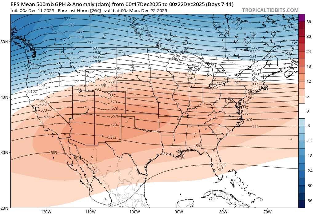 A very broad, very strong ridge of high pressure will setup across the Southwest and Plains. This may be close to record strength for this late in the calendar year. That would translate to high temperatures, possibly numerous record highs and record warm minimum temperatures across the country in the days before Christmas. For cold, you may only be able to look to New England, the Pacific Northwest, and the extreme Upper Midwest. Stay tuned.