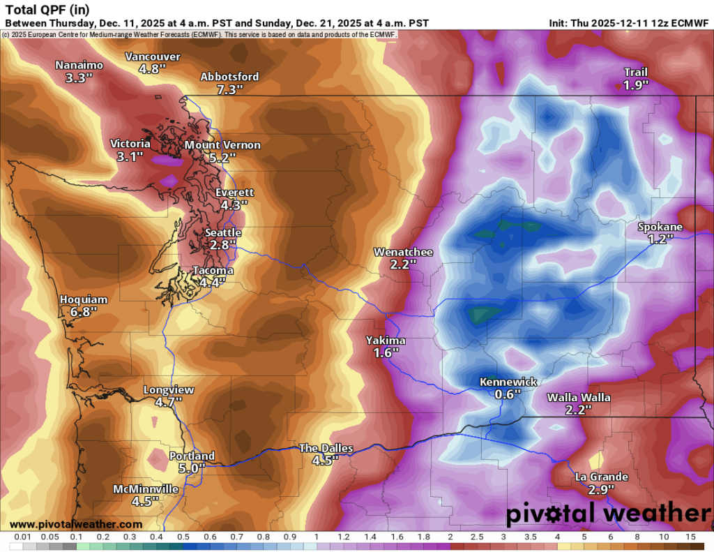 Liquid equivalents will be on the order 10 to 13 inches in the Cascades next week, or as it stands now at least. While the amount of water flowing into the river systems will be mitigated by the snow that accumulates and sticks around, we will probably see another round of (less extreme) flooding risks next week in the Northwest.
