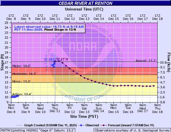 To the south, the Cedar River at Renton will also probably set a record tomorrow morning, when it reaches north of 17 feet.