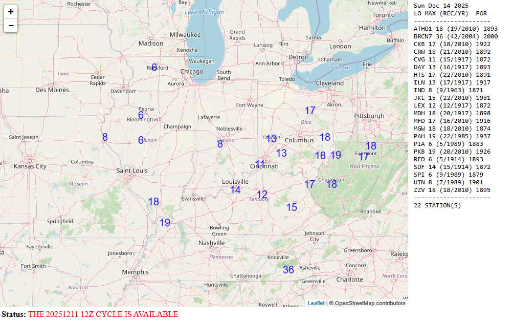 Forecast lows will be near 8 degrees in Indianapolis, 14 in Louisville, 11 in Cincinnati, and 13 degrees in Dayton. Wind chills of -10 to -20 will be widespread in the Midwest with -30s in Minnesota.