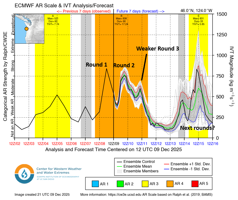 In the weather-world, it’s quite active. Right now, the focus is on the Pacific Northwest, which is getting absolutely crushed by an atmospheric river. Spike one just occurred this week. Spike two is inbound tonight and tomorrow.