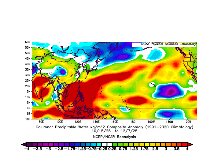 If you’ve followed weather globally, you’ve undoubtedly heard about flooding in the Philippines, Vietnam, Indonesia, Sri Lanka, Singapore, and elsewhere. In fact, if we look at how precipitable water anomalies have behaved since mid-October, it has been decidedly above normal from Southeast Asia across the Pacific into the Northwest.