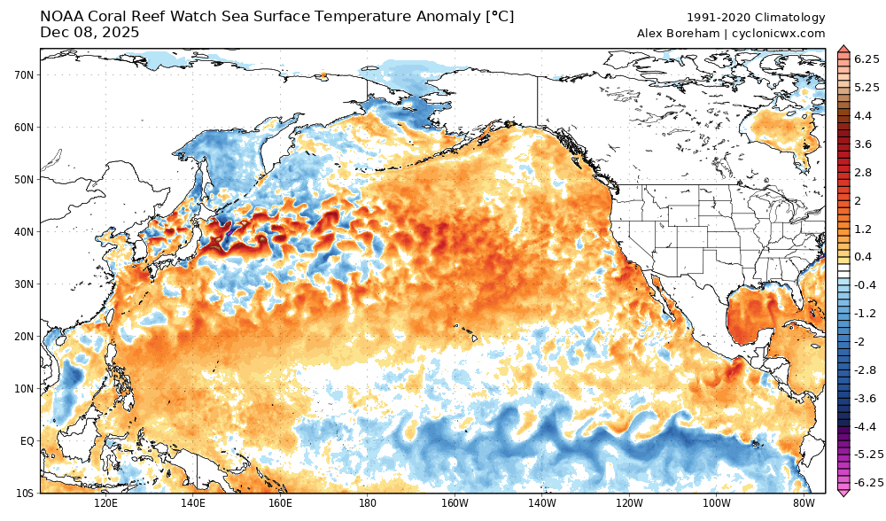 Clearly this pattern is juiced right now. The warm Pacific Ocean is not hurting this cause either. Warmer than normal water extends from the Philippines to north of Hawaii to the West Coast. It’s tremendously moisture-laden at the moment.
