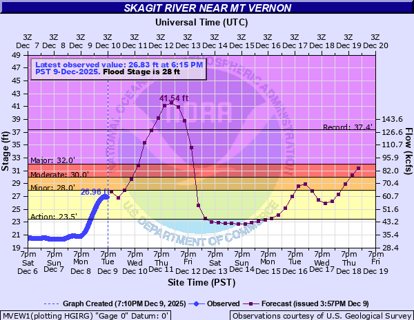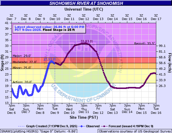 The flooding will be major to record on some rivers. For instance, the Snohomish River at Snohomish will reach around its record level of 33.5 feet set in November 1990. The Skagit River near Mount Vernon will likely smash its previous record, also from November 1990.