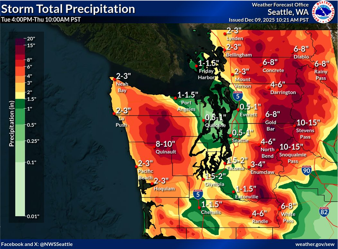Consult local media for a more detailed update on the situation, and follow the local NWS offices in Seattle, Spokane, Portland, and Pendleton for the latest. You can find the latest gauge forecast information at various locations in Seattle and elsewhere in Washington here.