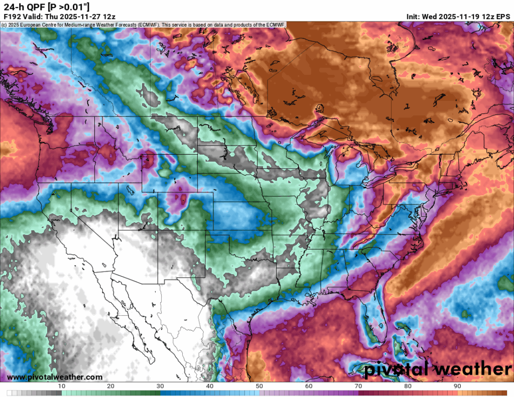 It’s a bit early to get too specific regarding Thanksgiving, but we can begin to make some assumptions. First, for the big travel day on Wednesday, it looks relatively quiet in Texas and the Southwest. An incoming storm system may be possible in the Northwest. We can look at probabilities of 0.01″ of liquid as a rough barometer for where weather will occur. It seems plausible that thunderstorms could impact travel through Atlanta or Florida. Winds could impact flights in Chicago and Minneapolis. And a storm system could bring some precipitation to the Northeast and/or Midwest, depending on exact timing. It does not appear that holiday travel looks severely disrupted at this time, but you may still want to watch the forecast.