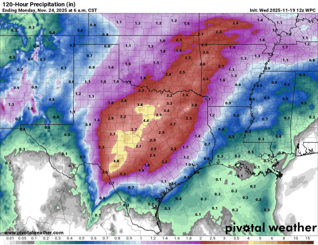 In brief: Stormy weather will bring some risk of flooding to Texas and perhaps Oklahoma over the next 5 days, followed by another storm system and cooler weather in the Eastern U.S. next week, just in time for Thanksgiving. Wednesday’s travel weather doesn’t look horrendous right now, but there are a couple things to watch. Plus, some links on newsier bits going on.