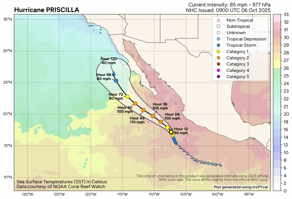 Moving to the Pacific, Hurricane Priscilla has gotten its act together off the coast of Colima and Jalisco in Mexico. Tropical Storm Watches are posted from Puerto Vallarta to south of Manzanillo as some fringe impacts from Priscilla are possible there. Priscilla will track northwest, paralleling the coast of Mexico and Baja but likely remaining offshore.