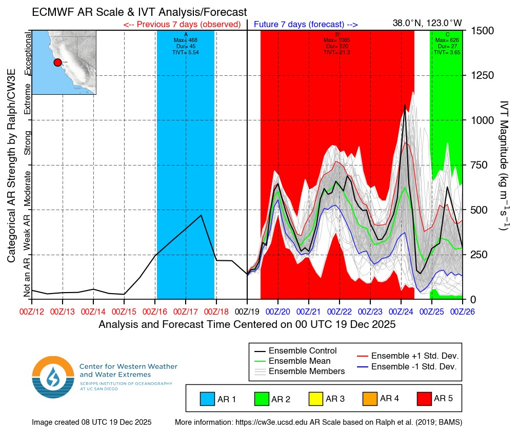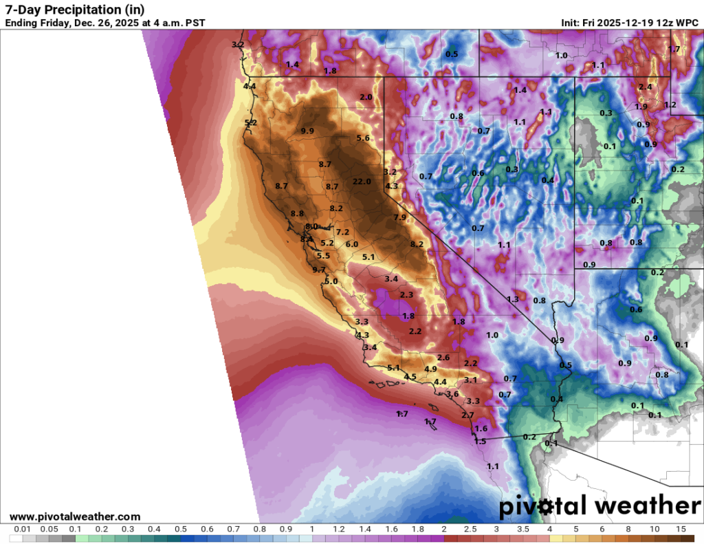 That continues Monday, with perhaps a slight downtrend in precip intensity. By later Tuesday and into Christmas Eve, it appears that a significant storm is going to deliver a multitude of hazards to California, including flooding rains, mudslide risk, debris flow risk, strong winds, and extremely heavy snow in the Sierra. This comes in two or three “waves” of action continuing into Christmas Day. Each one gets slightly colder, so snow levels will slowly drop through the event as well. Things reset next Friday and Saturday with a focus on British Columbia, before perhaps the next plume aims at the Northwest again on the following Sunday or Monday before New Year’s.
