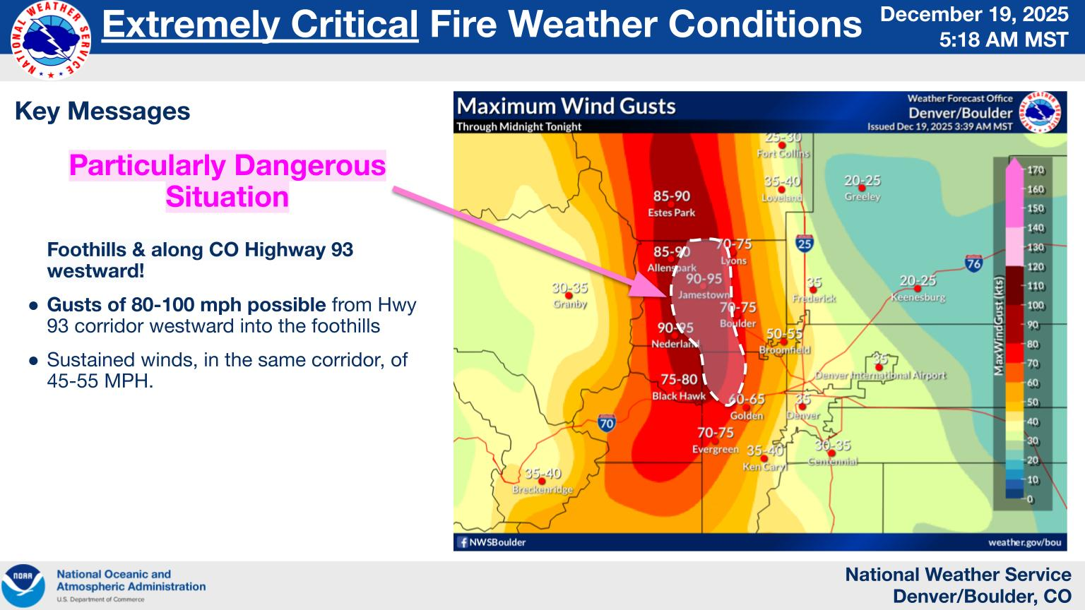 Another round of particularly powerful winds will occur today across the West, with a focus on Colorado again for perhaps the most significant impacts. A combination of low humidity and wind gusts in excess of 70 to 80 mph will be possible primarily west of the immediate Denver and Colorado Springs metros. Red flag warnings are posted in these areas with extremely high fire risk.